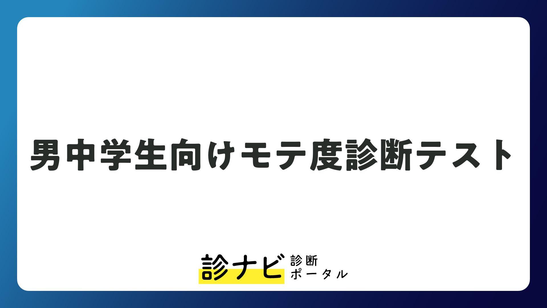男中学生向けモテ度診断テスト 【無料・会員登録不要】 本サイトではアフィリエイト広告を利用しています 診断 2025.08.08 まとめ いかがでしたか? 今回は男中学生向けモテ度診断テストをお送りしました。 ぜひ友達や家族に診断結果を共有してみてください! 今回は男中学生向けモテ度診断テストをお送りしました ぜひ、ほかの診断にも挑戦してみてください! 次回の診断もお楽しみに。